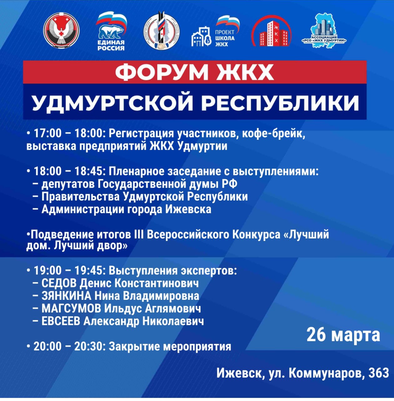 В рамках форума будет проведена конференция «ЖКХ для новичков» для участников проекта «На опыте: поддержка начинающих старших по домам и ЖКХ-активистов со стороны опытных коллег» с участием жилищных активистов из городов и муниципальных районов реализации проекта. Проект реализуется при поддержке Фонда Президентских грантов. В программе конференции: • Выступление депутатов Госдумы РФ, представителей Правительства Удмуртии и Администрации Ижевска. • Итоги III Всероссийского Конкурса «Лучший дом. Лучший двор». • Выставка предприятий ЖКХ Удмуртской Республики.